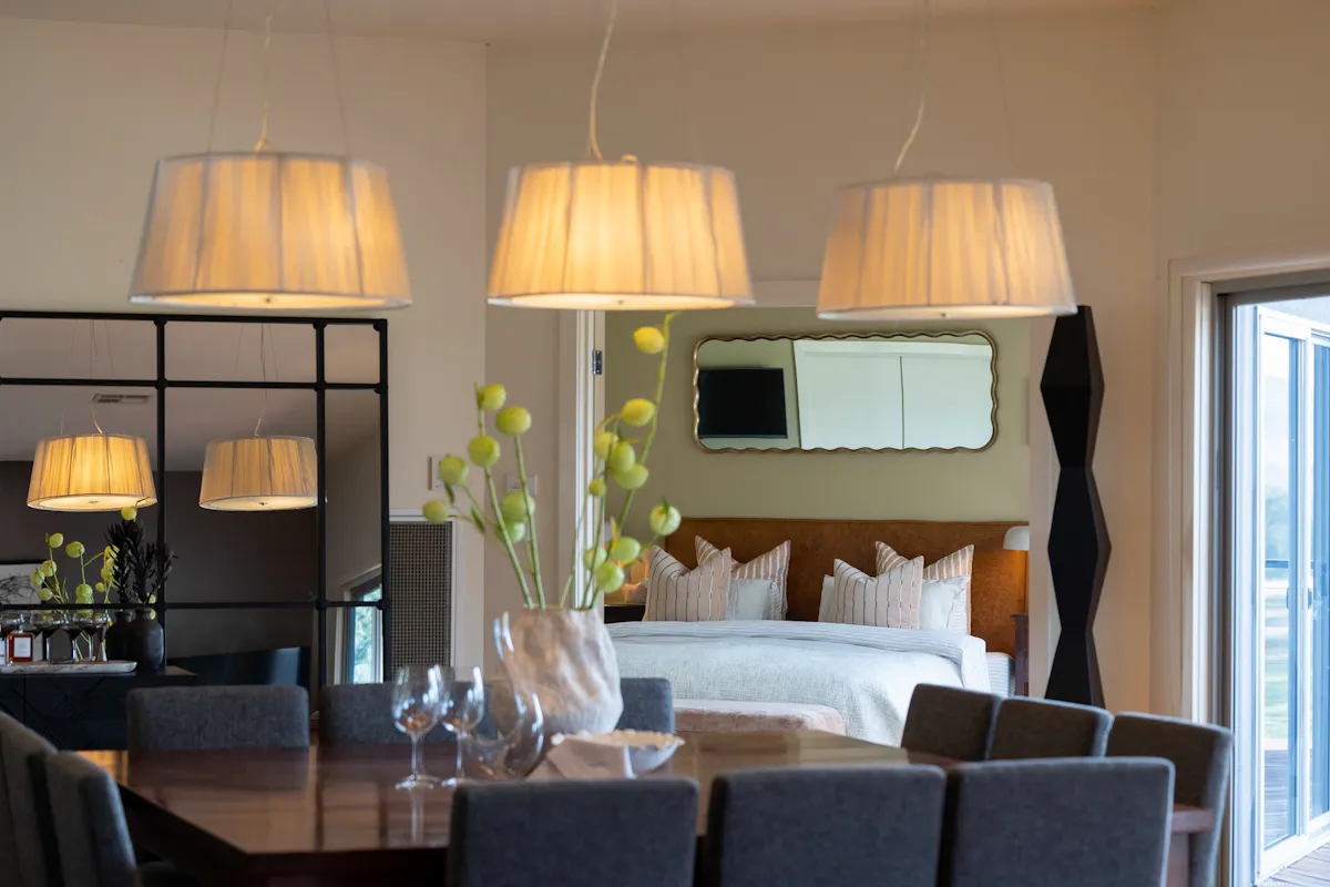 The open‑plan living, dining, and kitchen zone is beautifully bathed in light, with large windows and sliding doors framing the surrounding landscape. Warm Tasmanian Oak flooring grounds the generous scale of the home and enhances the visual harmony of the interiors.